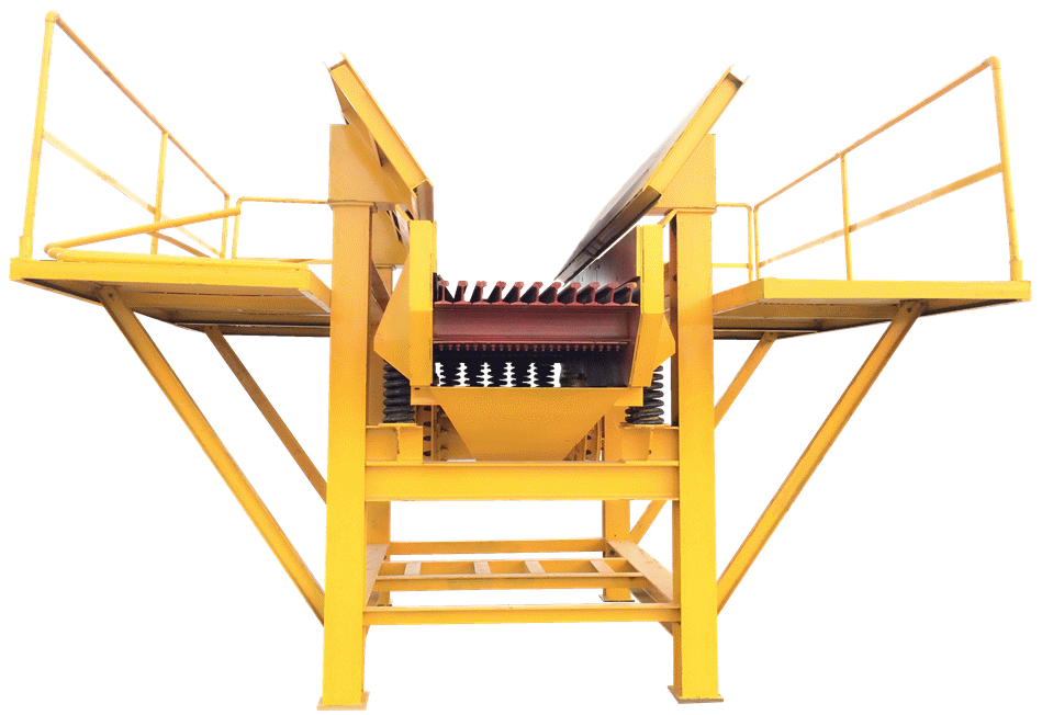 ZSW型振動給料機主要由振動機架、彈簧、振動器、電機振動架及電機等組成。激振器個是由二特定位置的偏心軸以齒輪相嚙合組成,裝配時必須使兩齒輪按標記相嚙合,通過電機驅動,使兩偏心軸旋轉,從而產(chǎn)生巨大合成的直線激振力,使機體在支承彈簧上作強制振動,物料則以此振動為動力,在料槽上作滑動及拋擲運動,從而使物料前移而達到給料目的。當物料通過槽體上的篩條時,較小的料可通過篩條間隙而落下,可不經(jīng)過下道的破碎工序,起了篩分的效果。